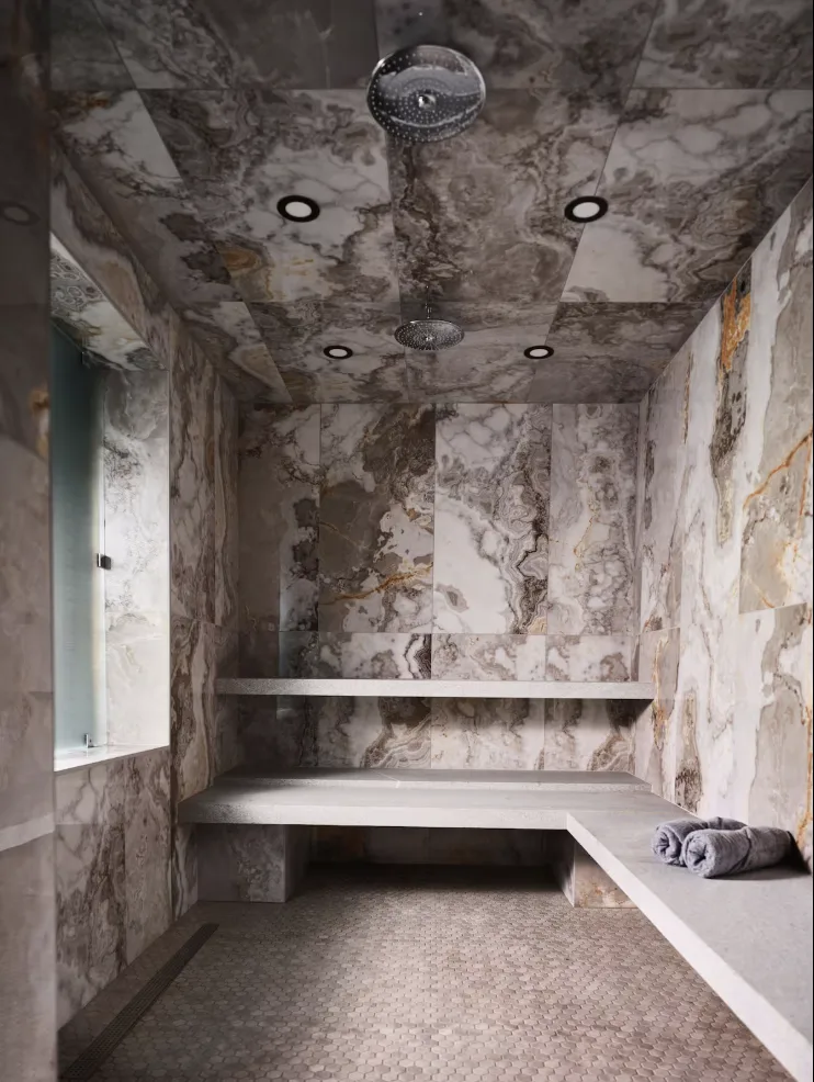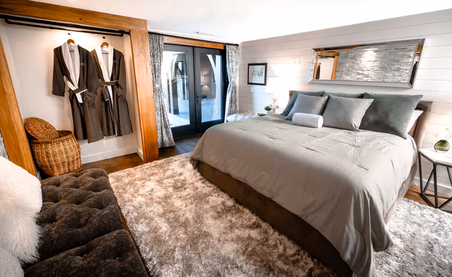 On-site cedar sauna, European steam room, waterfall-fed cold plunge, mineral hot tub, and treatment/yoga room for curated renewal