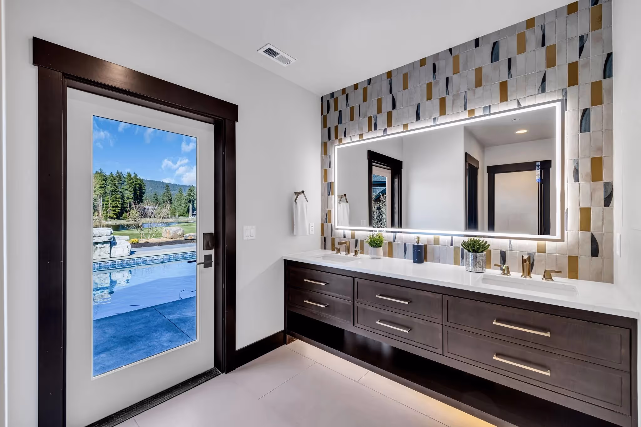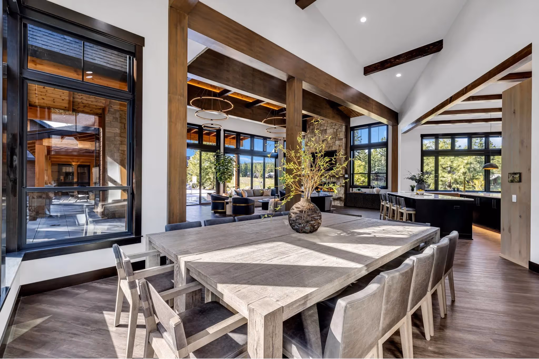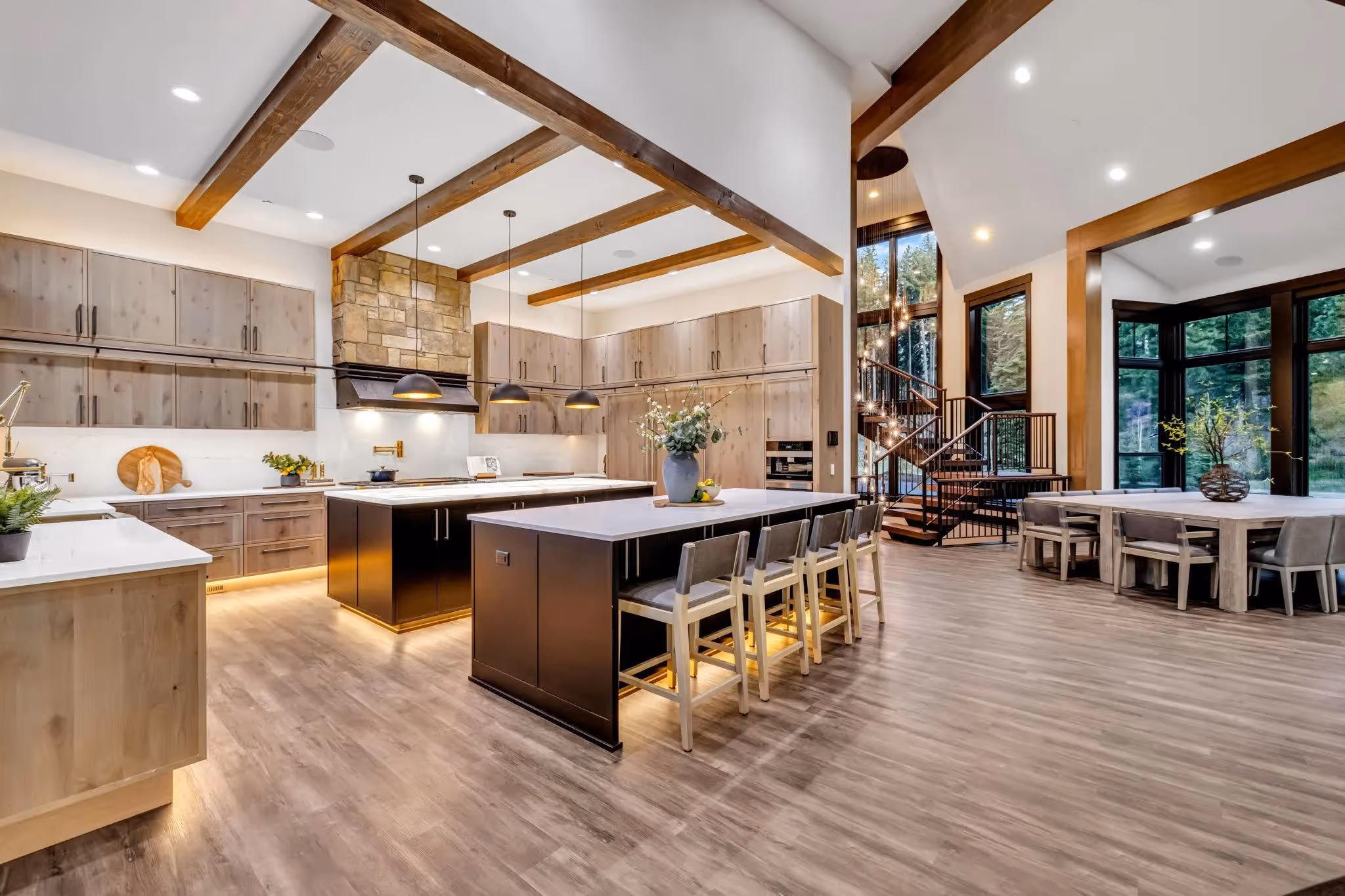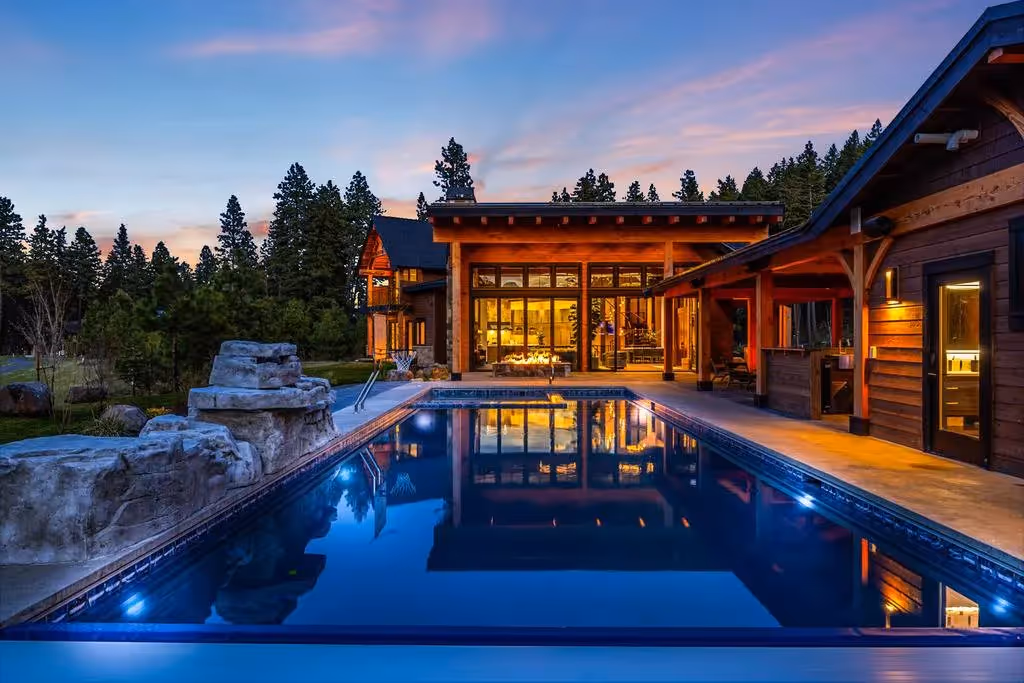The Cascadia House is a luxurious lodge near the mountains designed for unforgettable group getaways. The open-concept great room boasts vaulted ceilings and floor-to-ceiling windows that frame stunning forest views. Host your meetings in the great room or present in the movie theatre, then head down to the private speakeasy for games and lounging. Afterwards, unwind in the saltwater pool or fireside on the patio while taking in the wilderness.