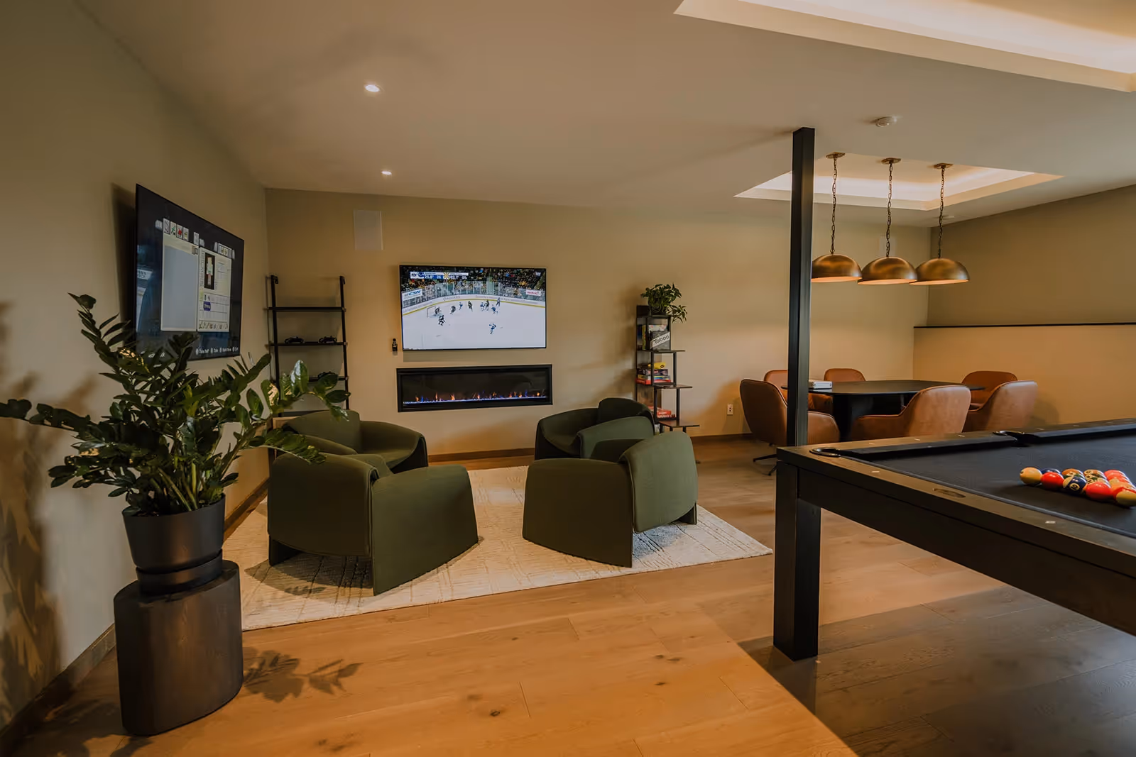 Large movie theatre, pickleball court, and games room